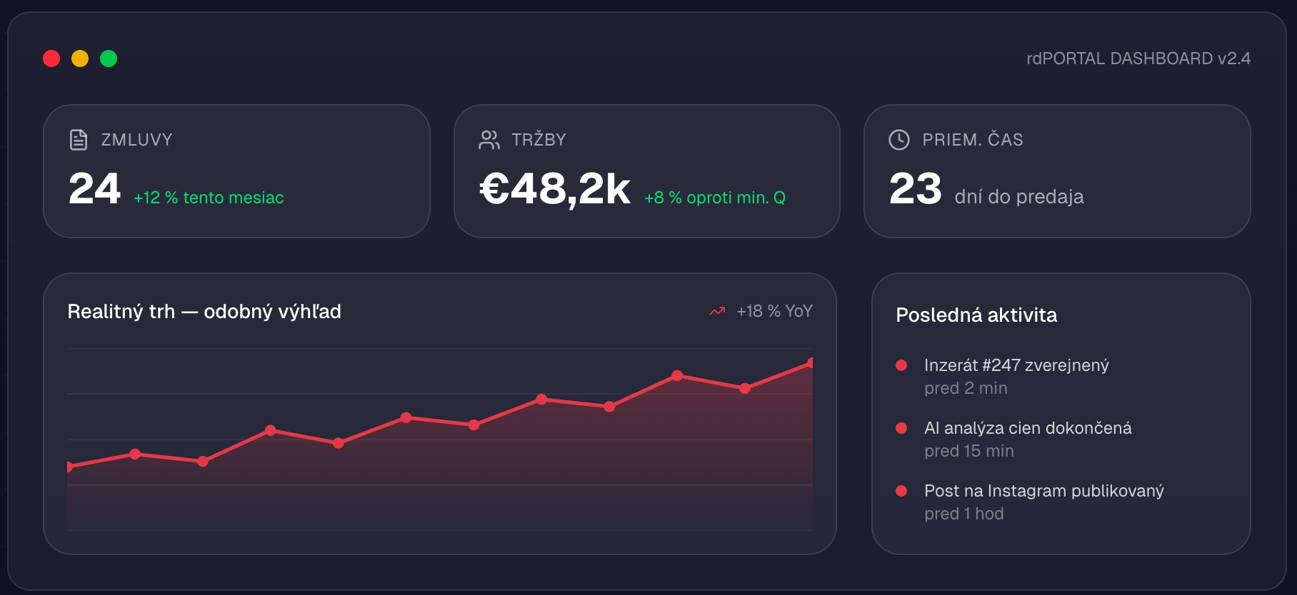 Jeden inzerát automaticky distribuovaný na Nehnuteľnosti.sk, Reality.sk a ďalšie. Plus automatické follow-upy a úlohy.
